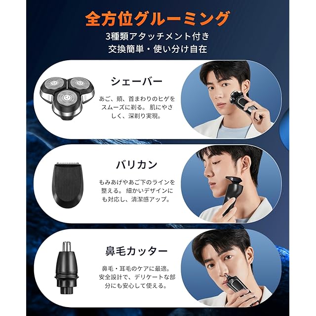 【三合一設計で全身メンテナンス】本電気シェーバーは、髭剃り用のヘッドに加え、鼻毛カッターとバリカンの2種類のアタッチメントが付属し、1台で顔まわりのケアを幅広くカバーします。工具不要の差し込み式ヘッドで、髭、鼻毛、もみあげのケアをこれ一台でカバー。数秒で簡単に付け替え可能なため、出張や旅行にも携帯しやすく、いつでも清潔な印象を保てます。