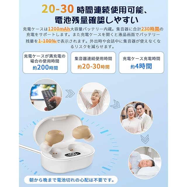 商品名:集音器 高齢者 しゅうおんき【2025年最新進化・音量増幅UP・ノイズ低減!】高齢者集音器 音声拡聴器 20-30時間連続使用 耳穴型 目立たない 片耳/両耳対応 充電ケースは200時間の充電をサポート 自動降噪 人間工学 軽量 快適 USB充電式 残量表示 自動電源ON/OFF 敬老の日 ギフト プレゼント 贈り物 祖父 祖母 父の日 母の日 掃除ブラシ&3種類イヤーピース付 日本語説明書