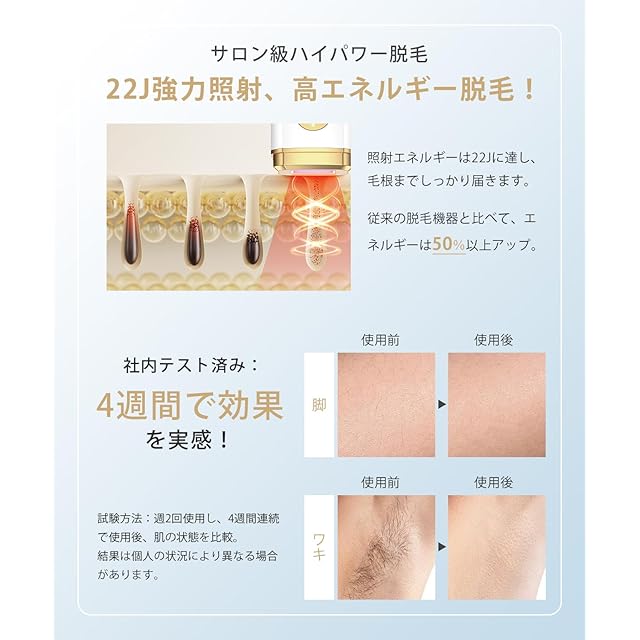 2025年夏新モデル家庭用脱毛器、魅力的な機能を多数搭載!IPL技術で22J高エネルギー出力、VIOゾーンなど広範囲対応。アイスポイント冷却で肌負担軽減。LCDスクリーン付き、手動/自動照射切替、3.8cm²ワイド照射面積で効率アップ。5段階エネルギー調節と4種類専用モード。防塵カバーや自動シャットダウン機能搭載、99万回照射可能。超軽量257gで持ち運び便利、2年間メーカー付き。