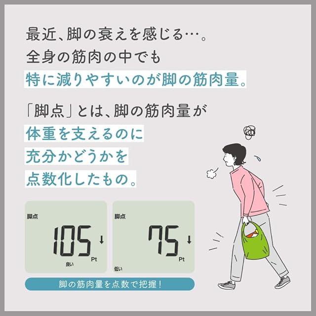 脚の筋肉量を点数化した「脚点」を表示 ・体重を支えるだけの脚の筋肉量があるかを「脚点」として点数化 ・「脚点」は50~150 ポイントで表示され、点数に応じて「良い」「やや低い」「低い」の3段階で判定 ・加齢の影響を受けやすい脚の筋肉量をチェックして、脚力低下に早めの対策を 毎日の継続した測定をサポート ・体重が急激に変化した場合にお知らせする「体重急激増減お知らせ機能」付き ・測定の継続状況にあわせて表示画面が変化する「マイサポ」で毎日の測定継続をサポート こだわりの使いやすさ ・乗るだけで測定ができる「乗るピタ」を搭載 ・立てかけ収納OK ・26mmの薄さで乗りやすい