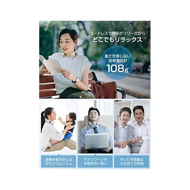 【人間工学に基づいた超軽量設計】柔軟なフレームと隙間を防ぐ設計により、優れたフィット感を実現し、動いてもズレないような構造に仕上がりました。こちらの首元リラクゼーション機器はわずか108gで、ボディがコンパクトで、動きの邪魔にならず、装着していることを忘れてしまうような超軽量設計となっており、首に余計な負担をかけないリラックスアイテムとなっています。肌触りの良い素材で、肌に優しく、着け心地も抜群です。