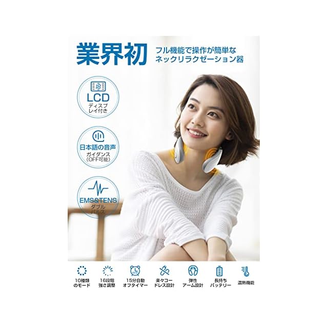 商品名:ネックケア 首 リラクゼーション器 Liaolee 新登場 (加温×EMS&TENSのW効果) 静音 軽量 首元リフレッシュ ネックリラックス ホットケア USB充電式 コードレス 10種類のモード 16段階の強度調整 液晶ディスプレイ 日本語音声ガイダンス 簡単操作 父の日 母の日 記念日 誕生日プレゼント お祝い 男女兼用 日本語説明書を同梱