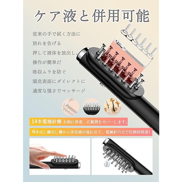 【ケア液と一緒に使用可能】取り外し可能な液体収納ボックスのデザインは、ケアソリューションと一緒に使用できます。 従来の手で塗布する方法とはおさらばです。ベタつかず、とても使いやすく、ワンプッシュで液が出て直接頭皮に塗布できます。均一なマッサージ力で頭皮への栄養の均一な吸収を促します。