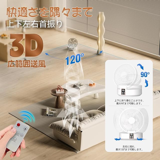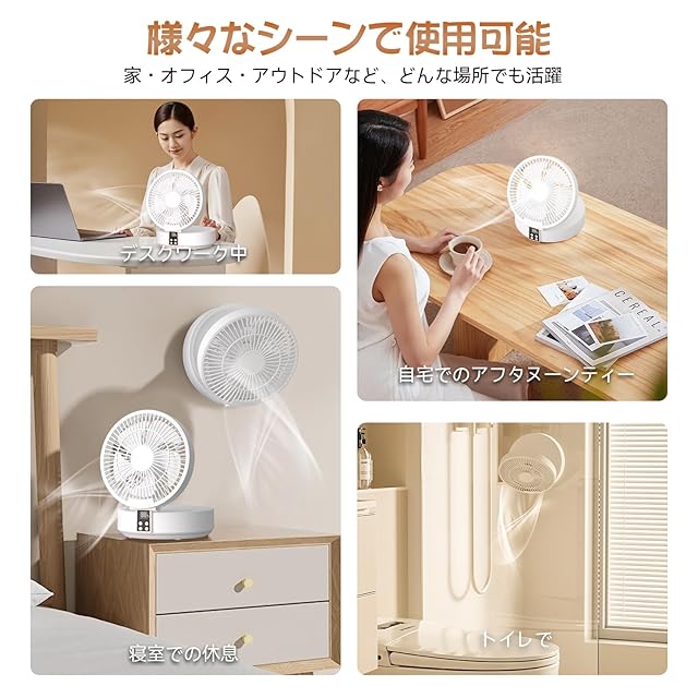 【上下左右3D立体首振り & 多様な使用シーン】弊社のサーキュレーターは左右180°の自動首振り機能と上下90°の角度調節機能を搭載して、送風に死角がありません。集まりの際には、大きな角度で風を広げて、隅々まで涼しさを届けます。一人でいるときは、机で働いている人や、ドラマを見ながらだらだらしている人にも、専用の微風を届けます。全室の空気を効率よく循環させます。また、壁掛け、折りたたみ、卓上という3つの使用モードを自在に切り替えられます。壁掛けは床面のスペースを節約し、配置が難しいキッチンやバスルームの湿潤な環境でも、さわやかな風を楽しむことができます。折り畳式は小さく持ち運び可能で、アウトドアピクニックやキャンプに持っていき、いつでも涼しさを楽しむことができます。卓上に置けば、オフィスや学習の良きパートナーとなり、個別化された送風で、さまざまな家庭や外出シーンに適応します(エアコンと一緒に使うと、効果が最も高くなり、より電気を節約できます)。