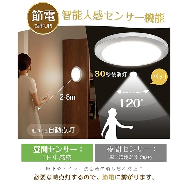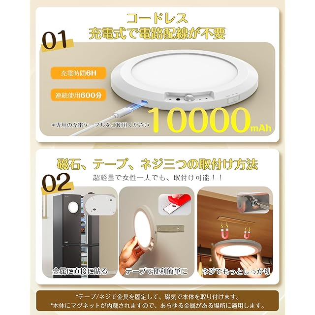 【極薄型デザイン&長持ちバッテリー】厚さが1.5cmの薄型照明器具は圧迫感がなく、お部屋がすっきりした印象に与えます。シンプル設計で和風・洋風を問わず、違和感なくご使用頂けます。直径が18cmの充電式センサーライトはコードレスで持ち運びやすいため、懐中電灯や非常灯としても大活躍!押し入れや物置きにものを探す時、停電や災害などの緊急時に役立ちます。完全一体化設計のため、防塵、防水、防虫、そして本体を分解してから掃除する必要がなく、お手入れも簡単です。USB充電式ライトは10000mAhのバッテリーを採用し、6時間満充電のあと600分連続使用可能で、蛍光灯より使用寿命が長くなります。 ご注意:充電の時、付属した専用充電ケーブルをご使用ください。