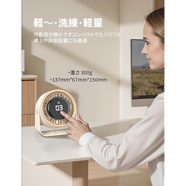 螺旋形ファンブレードとデュアルファンシステムで心地よい風を広範囲に届けます。静音設計のブラシレスモーター搭載で、寝室やオフィスでも安心。卓上・壁掛け・クリップの3WAY設置可能で、どこでも便利に使えます。安全設計のプロテクショングリルと簡単操作のディスプレイを装備。軽量コンパクトで持ち運びも簡単な、スマートな扇風機です。
