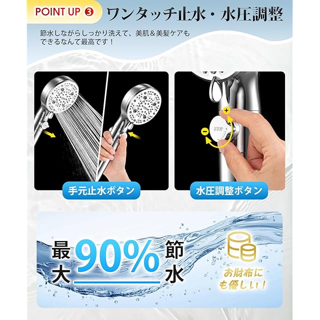 【最新モデル・9つ水流モード】お客様により良い体験を提供するため、市販のシャワーヘッドに比べて当社の節水シャワーヘッドは9つの水流モードにアップグレードしました!①マッサージモード②ストレートモード③ミストモード④ソフトモ一ド⑤レインモ一ド⑥レインミックスモード⑦ジェットモ一ド ⑧ストレート+レインモード⑨ パルスモード。体調やお肌の調子に合わせて、異なる水流モードをお選びいただけます。シャワータイムをまるでSPAのような特別な体験に変えます、一日の疲れを癒してくれます。