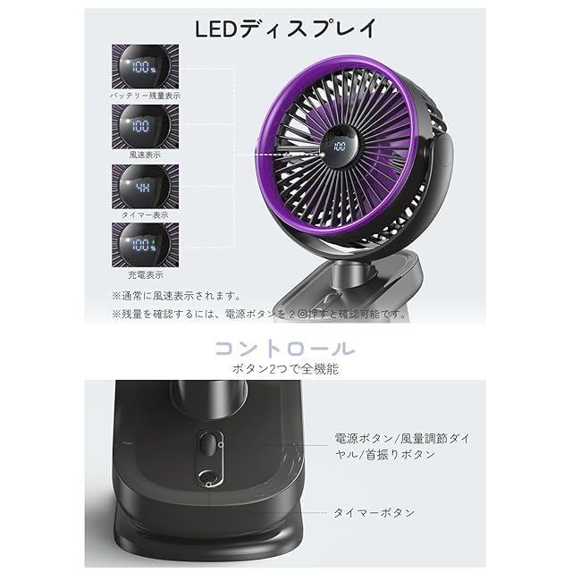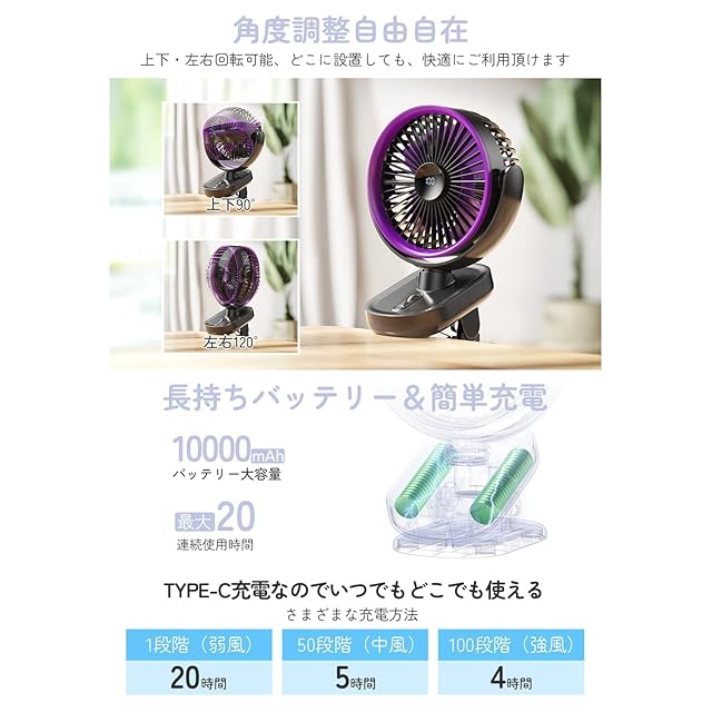 ✅【無段階風量调節&12H連続稼働】 クリップで様々な場所に取り付けられる利便性と、無段階の風量調節、そして12時間という長時間の連続稼働能力が組み合わさることで、より多くのシーンで「快適な涼しさを持続させる」ことが可能になります。クリップで固定すれば、多少の振動があっても安定して風を送れますし、長時間稼働のおかげで移動先でも電池切れの心配が少ないです。