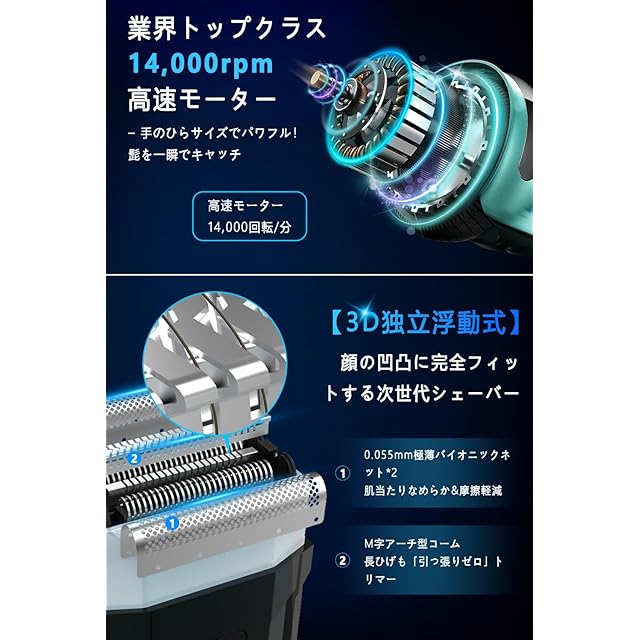 ⚡【3Dフローティング&14000rpm高速モーター】この小型シェーバーは新型3Dフローティングヘッドを採用。0.055mm極薄バイオニックネット*2枚が肌に密着し、深剃りながらも肌ざわりなめらか。長いひげ用のガイドコーム付きで整えながら剃れます。14,000高速回転/分の高速モーターが硬いひげも根元からスッキリ剃り上げます。