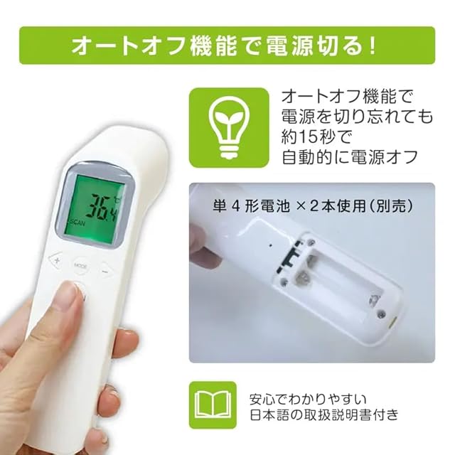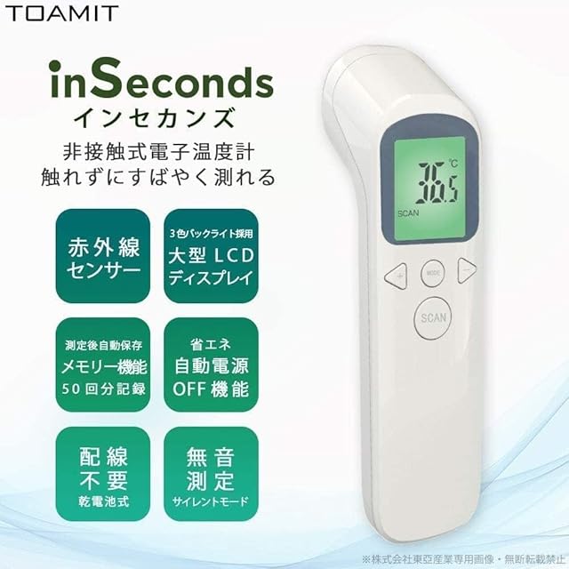 品名:非接触式電子温度計 インセカンズ<br> サイズ:約H155xW41xD40(mm)<br> 質:ABS+電子部品<br> 重量:約70g(乾電池含まず)<br> 電源:DC3V(单四乾電池2本)(別売)<br> 測定距離:3cm〜5cm<br> 測定精度:標準MODE:1.0CC〜60C)<br> 測定範囲:SCAN MODE:35.0C〜42.9C<br>