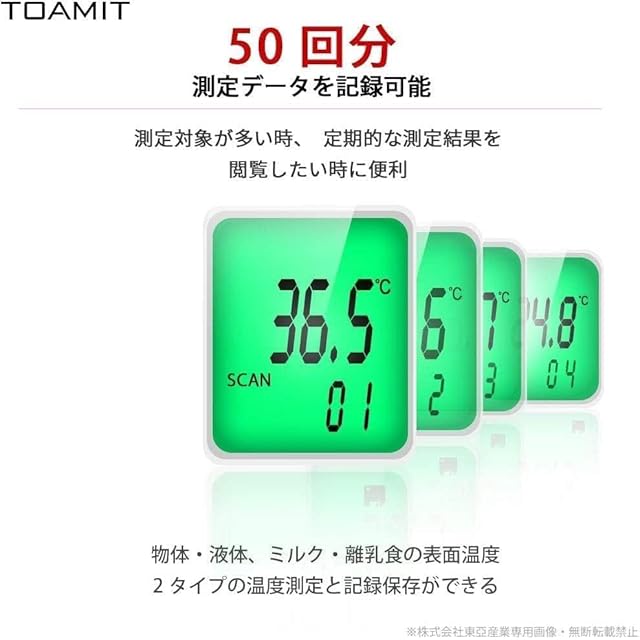 【メモリー機能&三色バックライト表示】測定した温度を最大50回まで自動的に記録します。三色で結果を表示、一目でわかりやすい
