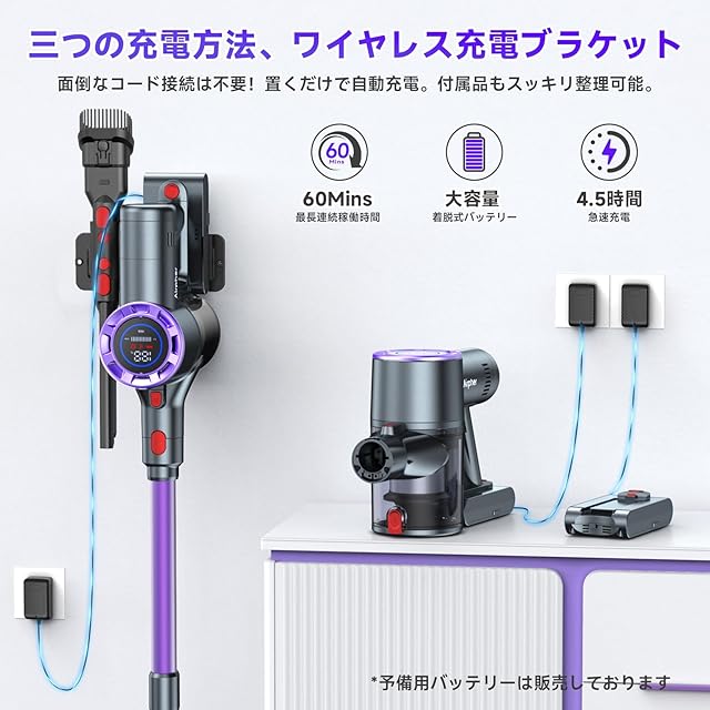 ✨【最大60分連続稼働。着脱式バッテリーで自由自在】 大容量バッテリーにより、最大60分の連続使用が可能。約4.5時間で急速充電完了。着脱式設計で交換も簡単、予備バッテリー(別売り)を使えば掃除時間を倍増できる。