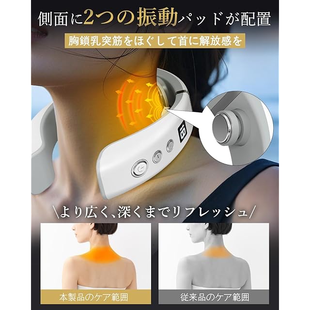 【広範囲を刺激】既製品に比べてもっと強く、気持ちいい“側方の「振動パッド」”を搭載。首の後方の「パルス・加熱パッド」と 首の側方の「振動パッド」で首周りをを広範囲にケアしてくれる!TENS×EMSの両方の周波数のパルス波を組み合わせることで、振動とパルスで、僧帽筋(首を支えている筋肉)を刺激してほぐします。同時に首の側面の胸鎖乳突筋(肩の違和感に繋がる)に心地よい振動が届きます。従来品は襟足のみのケアでしたが、このリラクゼーション器のケア範囲は首の首の両側まで広がります。 ※EMSは筋肉を直接刺激し効果を与えるため振動するものではございません。両パットがしっかりと肌に触れた状態でのみ効果を感じられます。