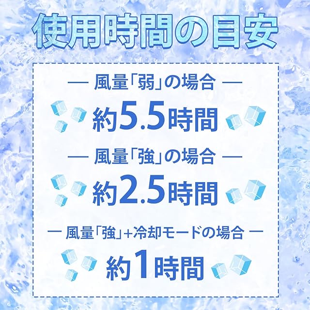 ■連続使用時間:風モード「弱」約5.5時間、風モード「強」約2.5時間、風モード「強」+冷却モード約1時間