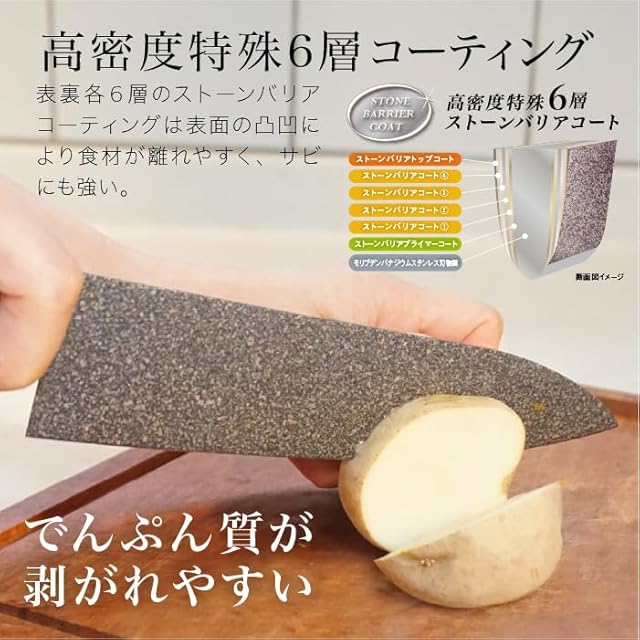 シリーズ累計売上50万本以上のストーンバリア包丁から新しく樹脂製ハンドルの包丁が登場! さらに軽く、そして食洗器対応になりました。 【特徴】 ◎スーパーストーンバリアコーティングによる3つの効果 刃の両面にそれぞれ6層のコーティングをおこない、表面を凹凸にしています。 (1)食材の切り離れをよくします (2)錆に強い (3)汚れがつきづらくお手入れ簡単 ◎日本の職人技術 刃物の町で有名な岐阜県関市の職人が、1本1本手作業で研いでいます。 刃をハマグリ形状にすることで、食材への刃の入りが滑らかに! ◎最先端機械による計算された刃の薄さ 0.01mmの精度で切削できる機械を使い刃の厚みを調整しています。 ◎お手入れのしやすさ コーティングのおかげで刃に汚れが付きづらいため、さっと流すだけでお手入れが簡単です。 またコーティングのない包丁と比べて錆びにも強いです。