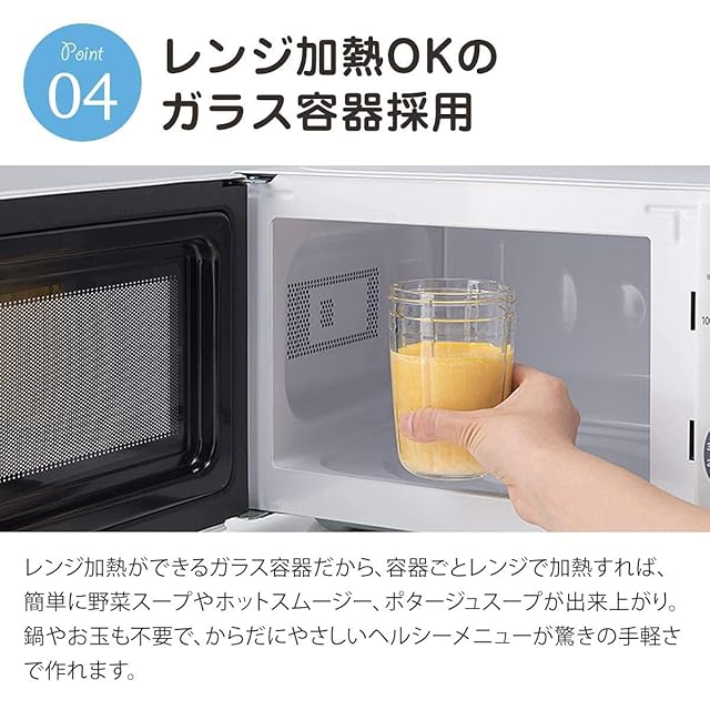 レンジ加熱OKのガラス容器採用:容器はレンジ加熱OKですので、粉砕後のジュース状の野菜をポタージュスープにもできます。食品の触れる部分は丸ごと煮沸消毒:食品が触れる容器とカッターは丸ごと煮沸消毒できるので、衛生的に使えます。