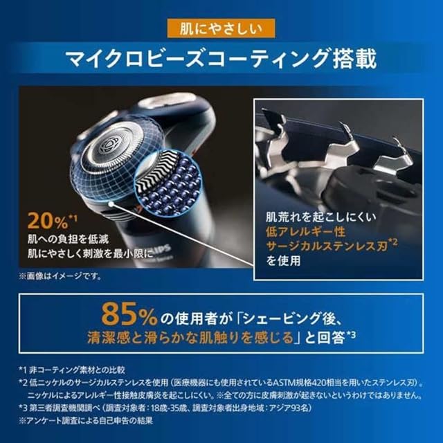 密着&早剃り もっと肌にやさしく ●マイクロビーズコーティング 20%肌への負担を低減。肌にやさしく、刺激を最小限に。1 平方センチメートルあたり最大100,000 個のビーズが施されたマイクロビーズコーティングがシェーバーヘッドに搭載。 ●360Dフレックスヘッド 柔軟性に優れた360Dフレックスヘッドが360度可動。顔の凹凸にしっかり密着し、剃り残しを低減。 ●早剃り&パワフルな剃り味 毎分55,000回カットの27枚刃搭載。効率的にヒゲをキャッチ&カットしながら、パワフルな剃り味で早剃りと深剃りを実現。 ●低アレルギー性サージカルステンレス刃 刺激性が少なく、肌荒れを起こしにくい低アレルギー性サージカルステンレス刃を使用。肌にやさしいヒゲ剃りを実現。 ●IPX7 防水仕様&本体丸洗い可能 IPX7 防水仕様で洗面所やお風呂場でも使用可能。ワンタッチでシェーバーヘッドが開き、水ですすぐだけで本体丸洗いできて簡単にお手入れ。