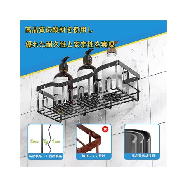 ✅【高品質な鉄製で抜群の安定感】本体には耐久性に優れた高品質鉄を採用しており、重たいシャンプーボトルや詰め替え用パック、スキンケア用品なども安定して収納できます。しっかりとしたフレーム構造で、毎日使っても歪みにくく、優れた耐荷重性能を発揮します。さらに、表面には防錆加工が施されているため、湿気の多いバスルームや洗面所でもサビに強く、清潔な状態を長く保てます。汚れた際もサッと拭くだけでお手入れも簡単です。