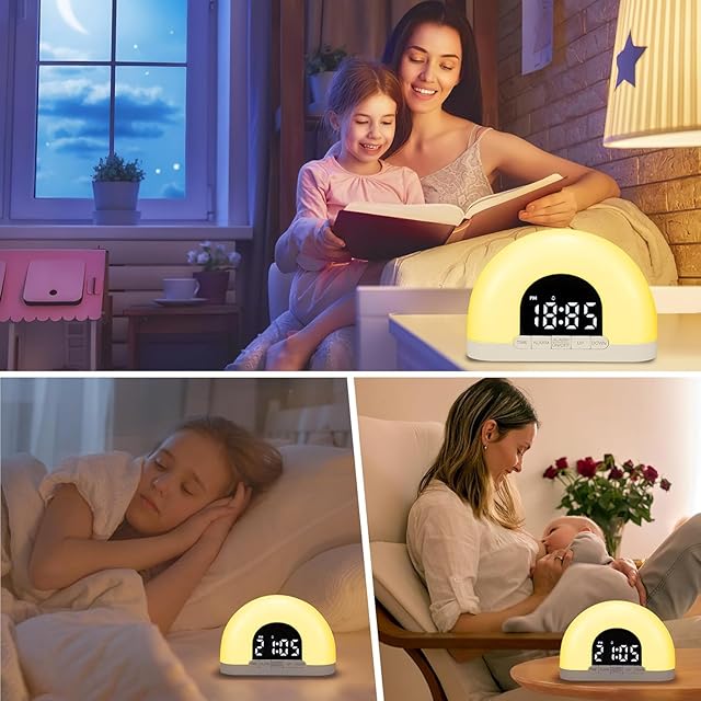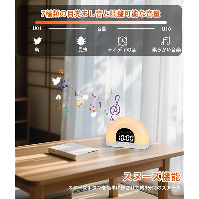 【9色のナイトライト&10段階の明るさ調節】この光目覚まし時計は、9色のカラフルなナイトライトを10段階の明るさに調節できます。そして、光めざまし時計は、停電の場合に時間とアラーム設定を保持するための内蔵のバックアップバッテリーが付属しています。
