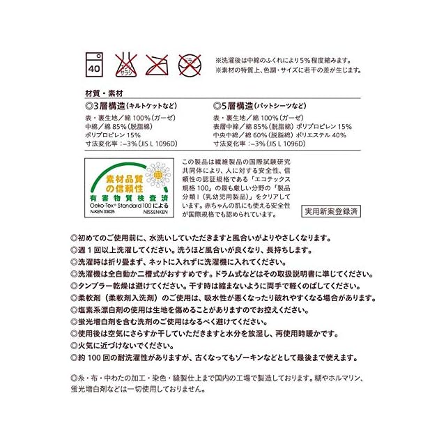 側地:綿100%(ガーゼ)/ 詰めもの表層・下層:綿85%(脱脂綿)、複合繊維(ポリエステル)15% / 詰めもの中層:綿60%(脱脂綿)、ポリエステル40%
