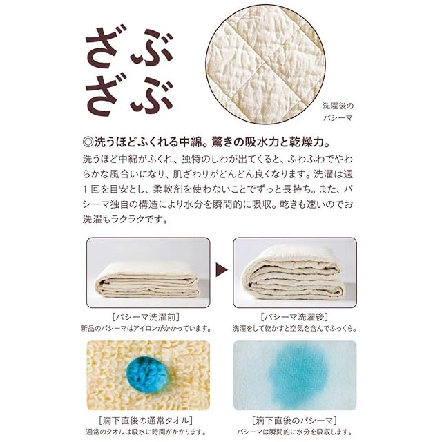 丸洗いできる清潔なパシーマは、吸湿性・吸水性・保温性に優れた夏でも冬でも年中使える寝具です。