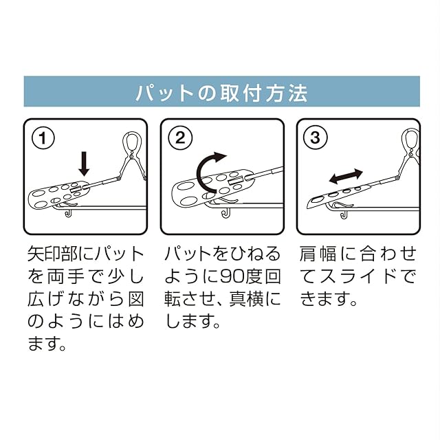 【立体的にきれいに干せるスライド式パット付きハンガー】肩の部分を立体的に干せるパット付きで型崩れを防ぎ、きれいに干せて乾きが早いのが特長です。パットはスライド式で衣類に合わせて調節できます。取り外しも可能です。