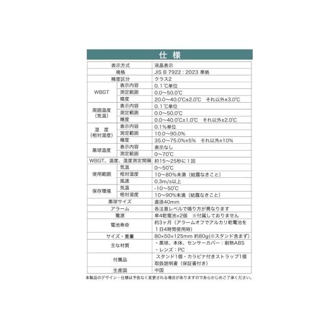 【JIS B7922 準拠品】JIS B 7922:2023クラス2準拠品。精度区分 クラススイス製の高性能センサーを内蔵し、黒球温度、温度、湿度の3つの要素を測定し暑さ指数(WBGT)を算出します。