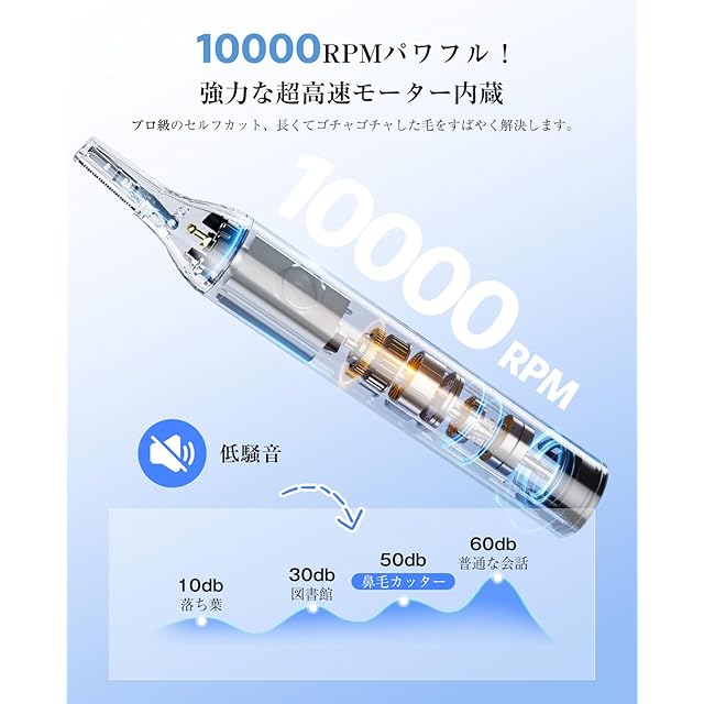 【10000RPM超高速モーター&静音設計】全銅製のDCモーターを搭載、業界トップレベルの高トルクブラシレスモーターを採用するまゆげカッター。カーボンブラシによる摩擦音を大幅に抑え、低損失を実現しながら耐久年数も向上。锐利な極薄鋼刃と良質な構造を採用し、苦痛と不快な引っ張りがない、長い/短い/太い/硬い眉毛や鼻毛や耳毛も瞬時にカット、最小の領域でも高速できれいに剃ることができます。自宅でのセルフケアを一層楽に、朝の忙しい時間帯や夜の静かな時間でも気軽に使用できるのが大きな魅力です。