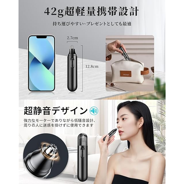 【静音設計&コンパクト仕様】鼻毛カッターは、マッドなボディに操作しやすいスイッチを備え、手になじみ使いやすいものとなってます。サイズは12.6 × 2cmと重さも60gです超小型なので携帯にも便利です。したがって自宅だけでなく、職場や出張、旅行先でも、どこにでも持ち運びができます。また本製品は静音設計なのでいつでも気軽にご使用できます。