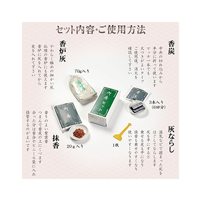 【セット内容】: 抹香20g 香炉灰70g 香炭3本(6回分)灰ならし1枚