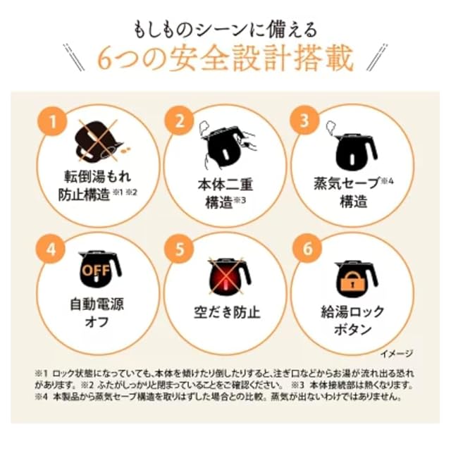 シンプル機能でベーシックな電気ケトル。ベーシックながらも6つの安全設計を搭載しており、使いやすさと安全性を兼ね備 えています。
