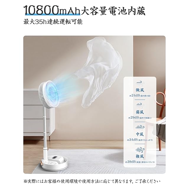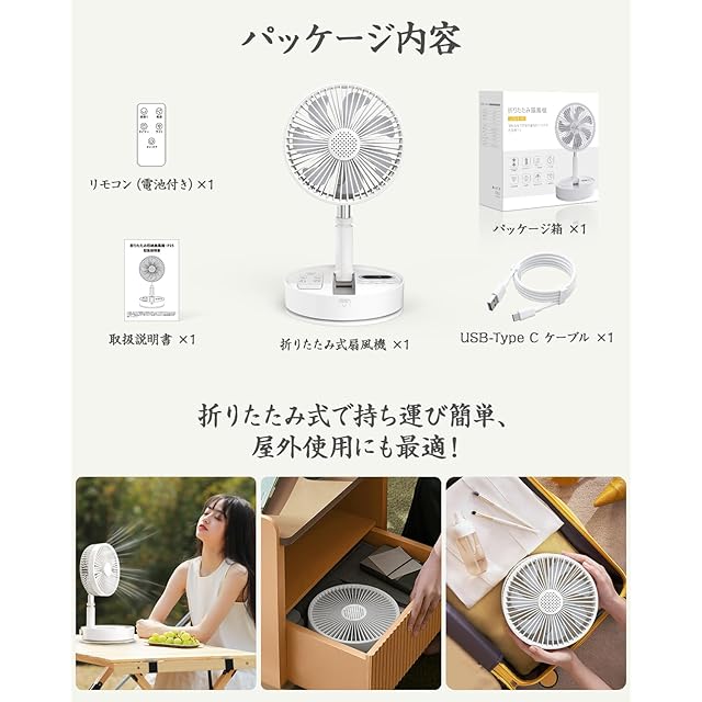 商品名:【自動首振り&最長35時間稼働】折りたたみ 扇風機 サーキュレーター 扇風機 兼用 10800mAh大容量 dcモーター搭載・静音設計 383-1020mm高さ調整伸縮式 コードレス・USB充電 タイマー付きリモコン付き 4段階風量調節 小型 コンパクトに収納 卓上〜リビング・寝室・キャンプ対応 収納袋付き (ホワイト)