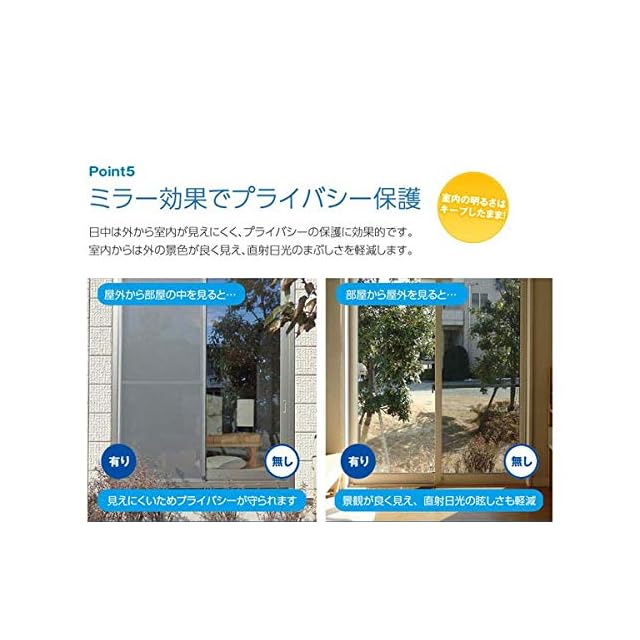 【ミラー効果でプライバシーも保護】日中は外から室内が見えにくく、プライバシーの保護に効果的です。室内からは外の景色が良く見え、室内の明るさはキープしたまま直射日光のまぶしさを軽減します。