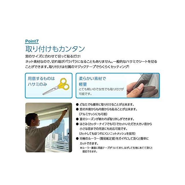【網戸に取り付ければ通気性も確保】ナノ粒子の特殊コーディングのため、繊維の目をつぶさず風邪を通すことができます。窓を開け放ち、網戸だけで通気しながら遮熱効果が得られます。(網戸に施工の場合)