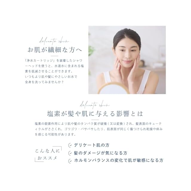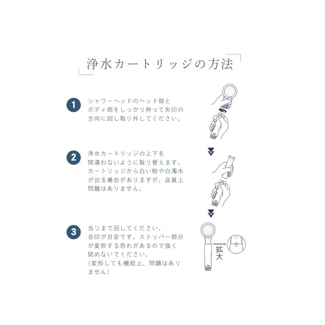 ・材質:ボリプロピレン、ボリエステル ・遊離残留塩素低减能力:約6000ℓ ・ろ材:亜硫酸カルシウム ・寿命設定流量:8ℓ/分 ・除去对象物:残留塩素 ・カートリッジ交換目安:約3か月(1日1人あたり8分使用した場合)