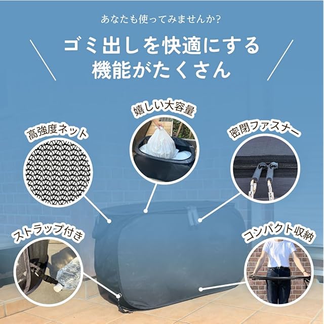 BEAST BUSTER カラス除け ゴミネットボックス<br> <br> 80cm × 48cm × 58cm 220リットル<br> <br> 大好評のカラスよけゴミ箱がバージョンアップして登場!<br> <br> ここがバージョンアップ<br> 1、底面が特殊ナイロンの強化素材に<br> 地面との擦れにも強い!<br> ※破れ防止のため、取っ手を持ち、なるべく引きずらずにご使用ください。<br> <br> 2、ワイヤー周りが特殊ナイロンの強化素材に<br> 地面に当たる部分をしっかり守る!<br> <br> 3、飛ばされ防止ストラップ付き<br> 飛散防止ストラップとウエイトストラップを付属<br> 柱やフェンスに 2Lのペットボトルに<br> <br> カラスや野良猫にゴミが荒らされる!<br> 頭の良いカラスはネットをかけてもめくってしまう。<br> 散らばったゴミ 見るのも掃除するのもいやな気分…<br> <br> そんな時は<br> BEAST BUSTER カラス除けゴミネットボックス<br> たくさん入る 大容量220L<br> <br> あなたも使ってみませんか?<br> ゴミ出しを快適にする機能がたくさん<br> 高強度ネット<br> 密封ファスナー<br> うれしい大容量<br> コンパクト収納<br> ストラップ付<br> <br> ポイント1、侵入ブロック!高強度ネット<br> カラスのくちばしや猫の爪を通さない約0.5mmの網目でしっかりゴミを守ります。<br> イヤなニオイもこもらない 通気性バツグン
