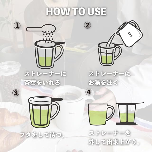 マグ1つでお茶もコーヒーも。 ストレーナーに茶葉/コーヒー粉を入れてお湯を注いでフタをして待つだけ。 簡単に1人分が淹れられます。