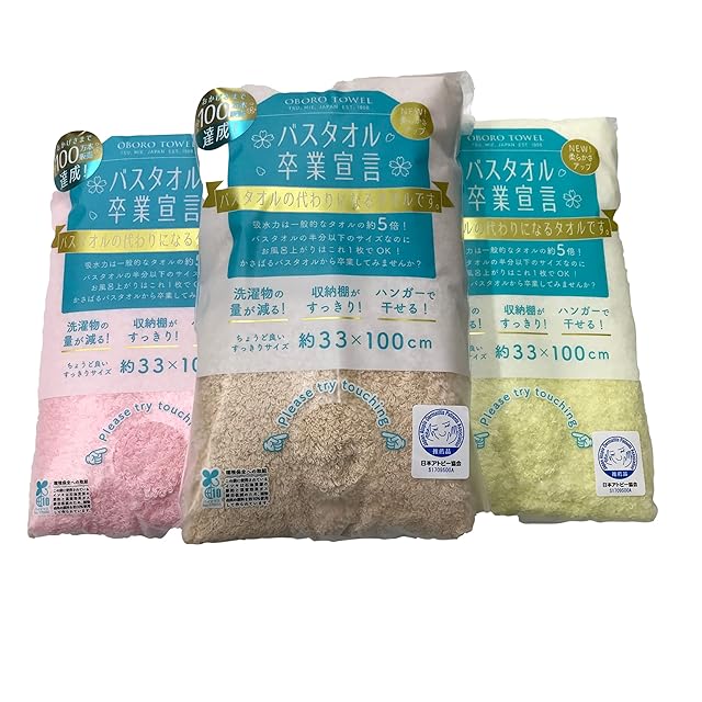 【内 容】バスタオル(ロングフェイスタオル) 【サイズ】約33×約100cm 【品 質】綿100%(20/1甘撚糸使用) 【生産国】日本製 【その他】エコテックス規格100認定マーク・日本アトピー協会推薦品認定シール付き 【ご注意】商品付属のお取扱い上のご注意に従って、ご使用してください。 ご使用のPC、スマホのモニターの環境によって色の見え方が違いますのでご了承ください。 バスタオルの代わりになるタオルです。 最近バスタオルを使わない家庭が 増えているのをご存知ですか? 大きなバスタオルはかさばるし、干すのも大変ですよね。かと言って、お風呂上がりにフェイスタオルを使うと 1枚では拭ききれず、2枚使うことになってしまったり。 このタオルは「甘撚りの糸」をおぼろタオル独自の晒し技術(特許申請中)によって、ボリューム感と軽量感、吸水性を実現しました。 コンパクトなのに1枚でお風呂上がりの濡れた髪や体をしっかり拭けます。 一般的な国産タオルと比べて 吸水速度と吸水量が約5倍!バスタオルの半分以下のサイズなのに体も髪もこれ1枚で十分ふけます。 かさばるバスタオルから卒業してみませんか?