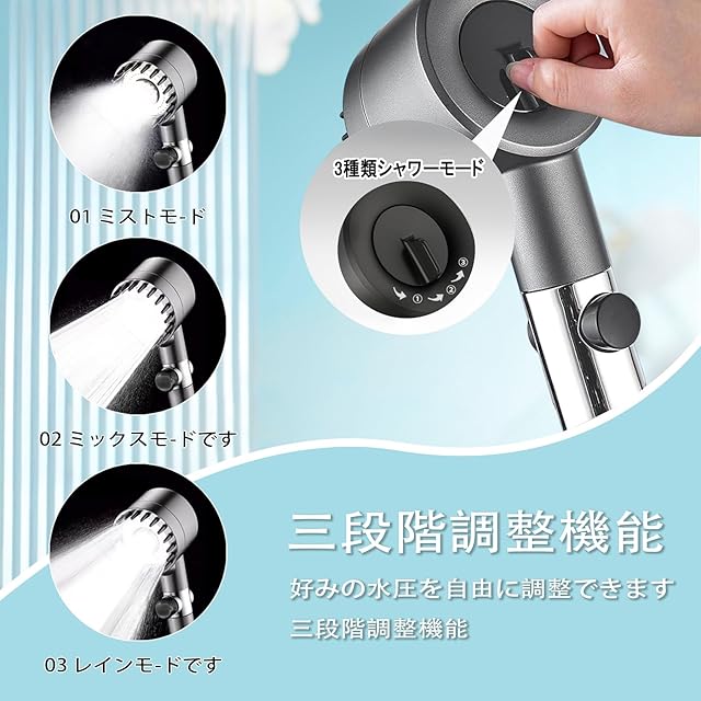 【スキンSPA・三段階モード】このシャワーヘッドは、霧のように細やかな水流を実現し、顔を洗うときも優しく、特に女性に最適です。入浴後の肌はシルクのように滑らかになり、水分含有量が60%以上アップします。家庭の執事のように、常に最高のシャワー体験を提供。節水と快適性を追求した三つの水流モードを搭載しており、01:ミストモード、02:ミックスモード、03:レインモードでシーンに合わせて使い分けられます。
