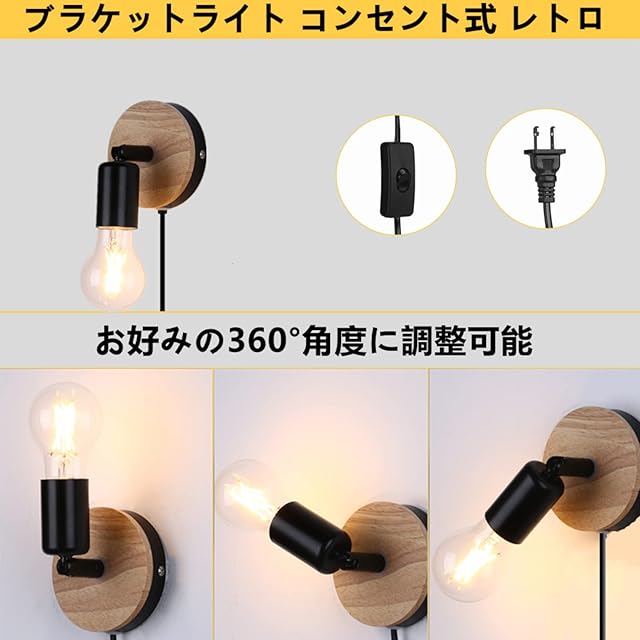 商品名:Lightess ブラケットライト コンセント式 レトロ 角度調整可能 ウォールライト 壁掛け照明 電球ソケット 工事不要 壁取付ランプ おしゃれ アンティーク調 工業 北欧風 ON/OFFスイッチ付き 玄関照明 階段 カフェ 寝室 居間 インテリア 廊下 イレ リビング ダイニング E26口金*1灯(電球別売)