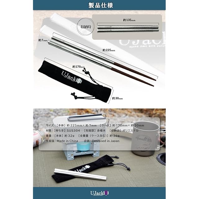 使いやすさを徹底追求したこの箸は、分割も組み立ても、引っ張るだけ、押し込むだけで完了。サクサクと使えるので、手間が省けます。 天然木の箸先は、違和感のない優しい口当たり。金属製のシェラカップや食器の不快な音を軽減し、金属の感触が苦手な方にもピッタリです。 持ち手のトップ部分は四角形にし、少し太めにデザインされています。これにより、転がりにくさを実現し、アウトドアシーンでも安定した使用感を提供します。箸を持ち上げる部分に行くにつれて、丸みを帯びたデザインとなっており、握りやすさを追求しています。また、日常での使用感を大切にし、家庭用の箸と同じ長さに設計。ありがちなキャンプ用の箸としては短すぎる、といった問題を解決しました。 箸先の天然木は、細めに仕上げて摘まみやすくし、使い心地を追求。老若男女問わず、取り回しやすい寸法を実現しました。 【製品仕様】 サイズ:(本体)約225mm×約7mm (ケース)約170mm×約30mm 重量:(本体)約32g (全重量 ケース含む)約36g 材質:(持ち手)SUS304 (先端部)赤檀木 (収納袋)ポリエステル 梱包サイズ:167×32×20mm 価格:オープン ブランド: UJack(ユージャック) 生産国:Made in China 企画::Designed in Japan 製品コード:4589654914377