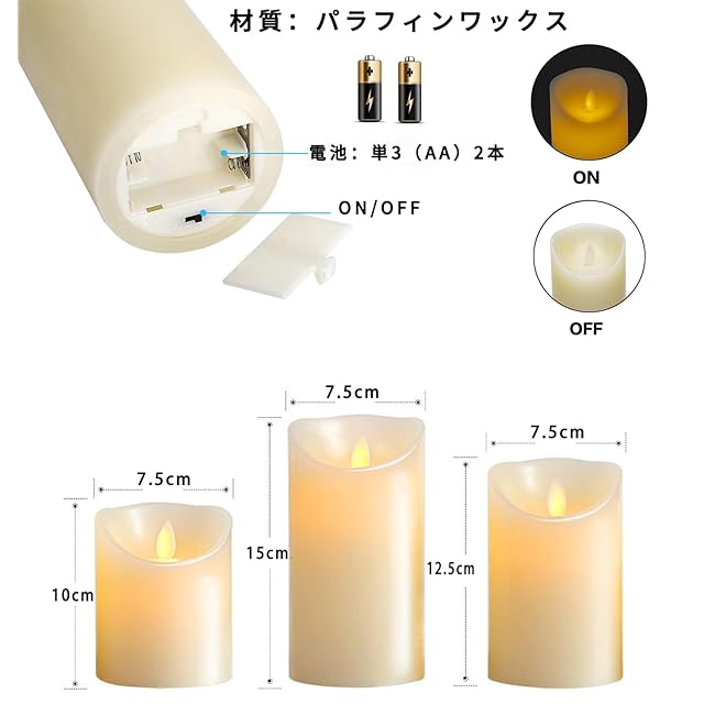 ▶【セット内容】: LEDキャンドル×3本 サイズ:L(直径7.5cm×高さ15cm)、M (直径7.5cm×高さ12.5cm)、S(直径7.5cm×高さ10cm)単3電池(別売り)、リモコン*1、リモコン用電池:ボタン電池1個(付属)、取扱い説明書*1 ✅【注意事項】LEDランプの寿命は50,000時間以上です。次のようなヒントにもっと注意を払う限り、それは再利用可能です。 ※このろうそくは本物のワックスで作られており、可燃性です。このろうそくに火をつけようとしないでください。 ※直射日光を避け、熱源から遠ざけ、極端な温度にしないでください。ろうそくが柔らかくなったり溶けたりすることがあります。※防水性がないため、水のかかる恐れがある場所では、ご利用にならないでください。