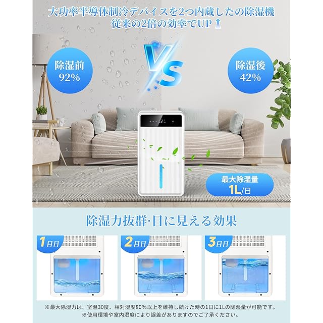 「デュアルコア除湿で梅雨も夏も快適!業界トップクラスの除湿性能」この除湿機は2つの高性能除湿コアを搭載し、従来モデル比198%の除湿効率を実現。1日最大1Lの水分を除去可能で、東京の平均湿度70%の環境下でも、わずか2時間で10畳空間の湿度を45%に低下させます。特殊な3D気流設計により、部屋の隅々まで空気を循環させ、結露やカビの発生を根本から防止。実験データでは、押し入れの湿度を24時間以内に40%以下に維持できることを確認(※自社実験結果)。除湿力が持続する「ナノチタンコートフィルター」を採用し、5年間の使用後も95%以上の性能を維持。他の製品と異なり、高温多湿な日本の夏(35℃以上)でもモーターオーバーヒートなしで連続運転可能です。