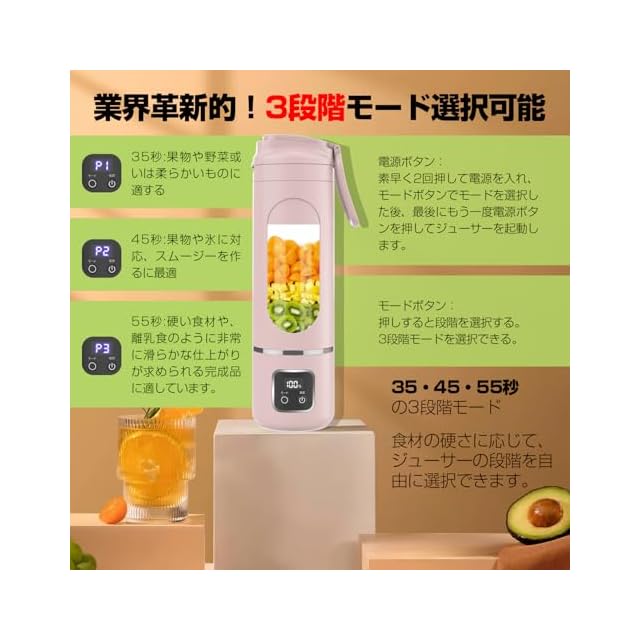 【3段階調節可能!スマートジューサー新登場】食材に合わせて賢く選択!P1モード(35秒):みずみずしいフルーツ/やわらかい野菜に最適、朝食のフレッシュジュース作りに。P2モード(45秒):氷×フルーツの最強コンビ!カフェ級スムージーが簡単完成。P3モード(55秒):硬い食材もベビーフードもなめらか仕上げ、にんじんりんごジュースや豆乳スープも。ご注意:氷単体でのご使用は避け、必ずフルーツや牛乳と一緒に(刃物保護&モーター長寿命化のため)。