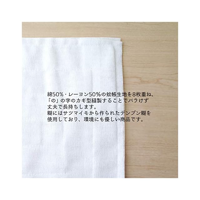 奈良 蚊帳ふきん (12枚入り) 【商品情報】 ■本体サイズ (約)33×30cm ■素材 蚊帳生地:綿50% レーヨン50% のり:サツマイモでんぷんのり ■製法 蚊帳生地を8枚重ね「の」の字のカギ型縫製 ■カラー 白