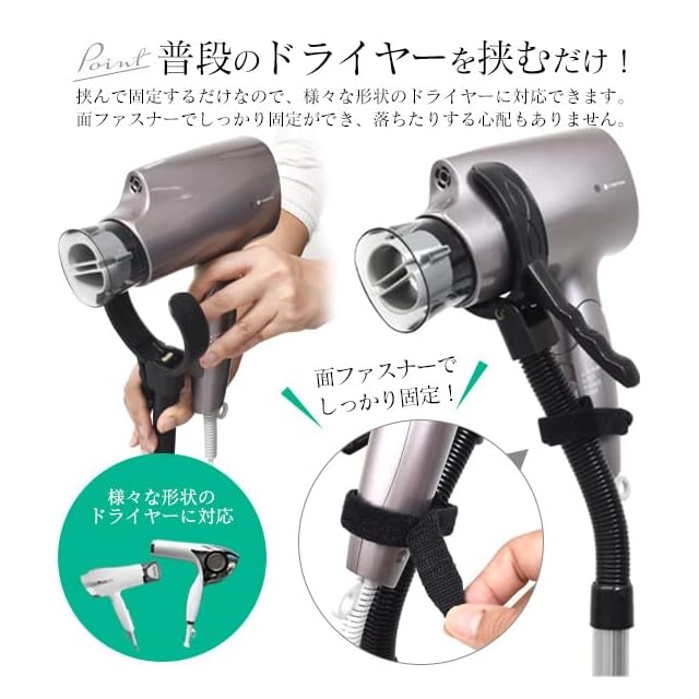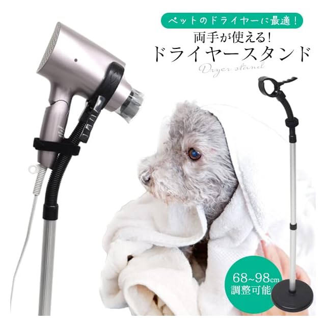 両手が使えて便利なドライヤースタンドです。<br>普段使っているドライヤーをクリップに挟んで固定するだけなので、<br>様々な形状のドライヤーに対応できます。<br>両手が自由に使えるので、お風呂終わりのペットの毛を乾かす際に便利です。<br><br>角度や方向を自由に曲げることができるので、お好みのポジションで固定することができます。<br>面ファスナーでしっかり固定ができるので、ドライヤーが落ちる心配もありません。<br>68~98cmの高さ調整が可能です。<br><br>