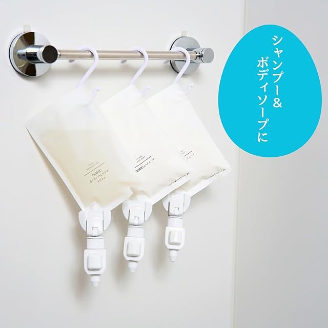 【簡単便利】 面倒な詰め替え作業不要。 詰め替えパックを簡単セットするだけでそのまま使える。 シャンプーリンスなどの詰め替えパックに取り付けることで使用することができる。