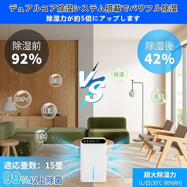 【ダブルペルチェ素子搭載!およそ50%UPした除湿】Dawncom 除湿機 は今まで単一ペルチェ式の他社製品と比較して、最新進化したペルチェ式の 除湿機 は「ダブルペルチェ素子搭載」されており、より空気接触面積が大きくなり、除湿効果が50%上がります。(温度30℃、湿度80%の状況で)1日あたり最大1000mlの除湿が可能です。夏の梅雨に衣類乾燥と湿気取りにも、冬の部屋干しにも、いやな湿気をパワフル除去し、抜群な除湿力で一年中に室内環境を快適に!