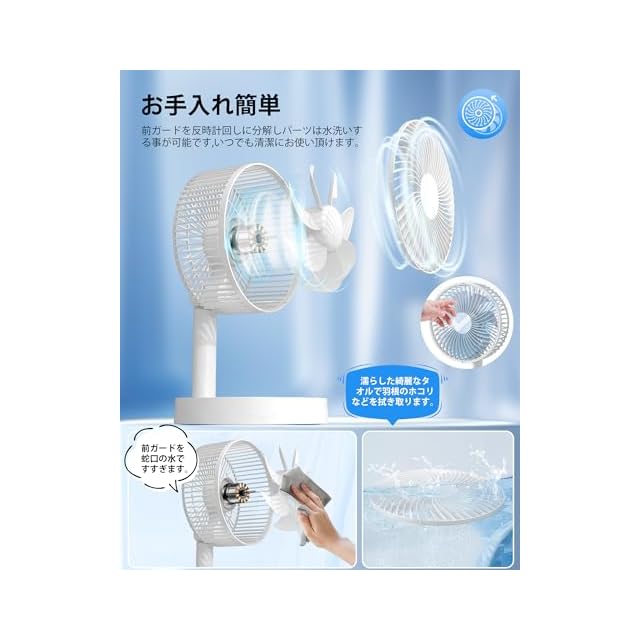 ❉彡【高さ調整・折り畳み式】小型折り畳み式卓上扇風機は上下に高さ調整る機能を配置され、本製品は折りたたみ式で、折りたたんだサイズ:21 * 9cm。伸縮と折り畳みを組み合わせて、 卓上扇風機、リビング扇風機、携帯扇風機3in1の設計で、高さも需要に応じて最大32cmまで調整できます。卓上扇風機本体には、優れた素材のABS樹脂を採用し、衝撃や低温に抵抗し、耐久性が抜群で、異臭なく安全とエコです。防護カバーの隙間が狭い安全設計、指を挟む心配がありません。お手入れのとき、特別な工具など不要で、扇風機の前カバーを反時計周りに回すと、前カバーが外れますので、汚れた扇風機の羽根をさっさと簡単に拭き取ることができます。