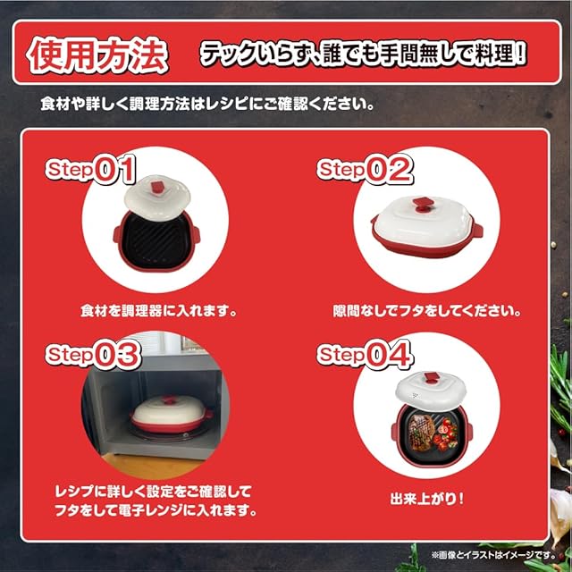 電子レンジで“焼く”ができる!まったく新しい調理スタイルを実現する、1台6役の万能レンジ調理器。特殊アルミメッキ素材+フッ素加工により、マイクロ波を熱エネルギーに変換。グリルプレートが約180℃以上まで加熱され、本格的な焼き目がつきます。さらに、煮る・蒸す・茹でる・炊く・炒めるにも対応しており、どんな食材でも手軽に美味しく調理可能。面倒な火加減や油跳ねも気にせず、食材を入れてレンジにお任せ!後片付けも簡単。レシピ付きで料理初心者にもおすすめの時短キッチンアイテムです。